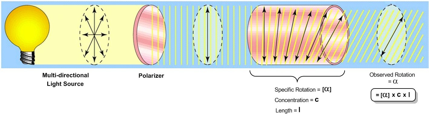 - The analyzer is rotated till the equal intensity of light is obtained in the field of view of telescope. The new position of analyzer is noted in the observation table. The difference in the two readings gives the angle of rotation. Specific rotation of solution can be determine use in the above formula.
